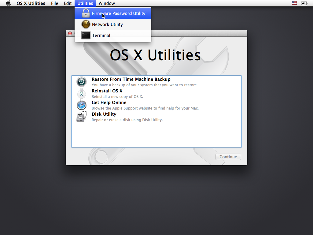 11) Go back to the Menu at the top of the screen and click OS X Utilities > Quit OS X Utilities and you will be prompted to restart the Mac