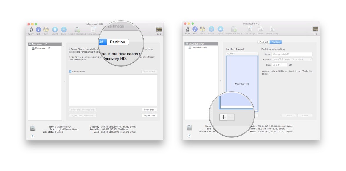 Click on Macintosh HD to highlight it and then click on Partition and then click the + button and use the slider to create a smaller area beneath your main partition.